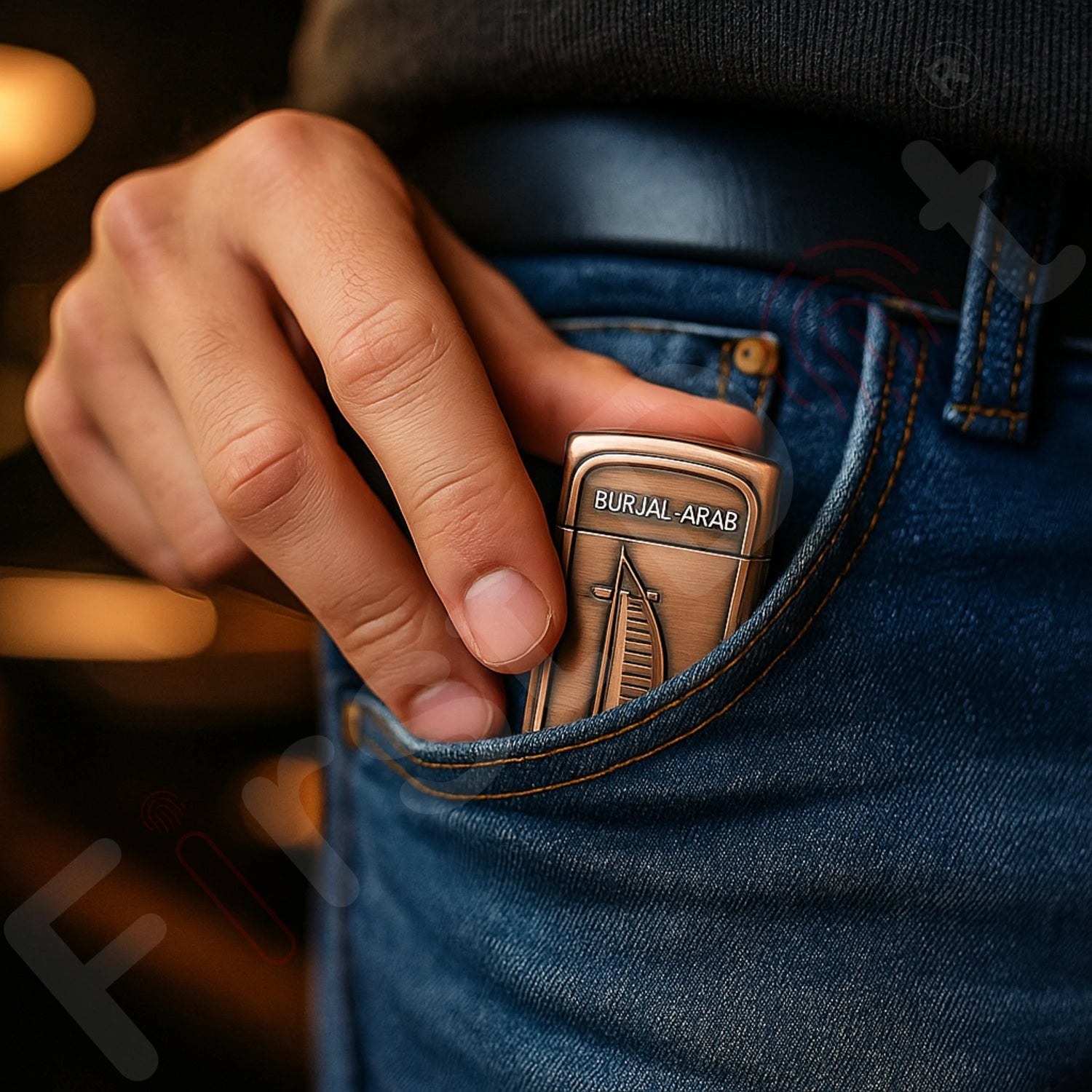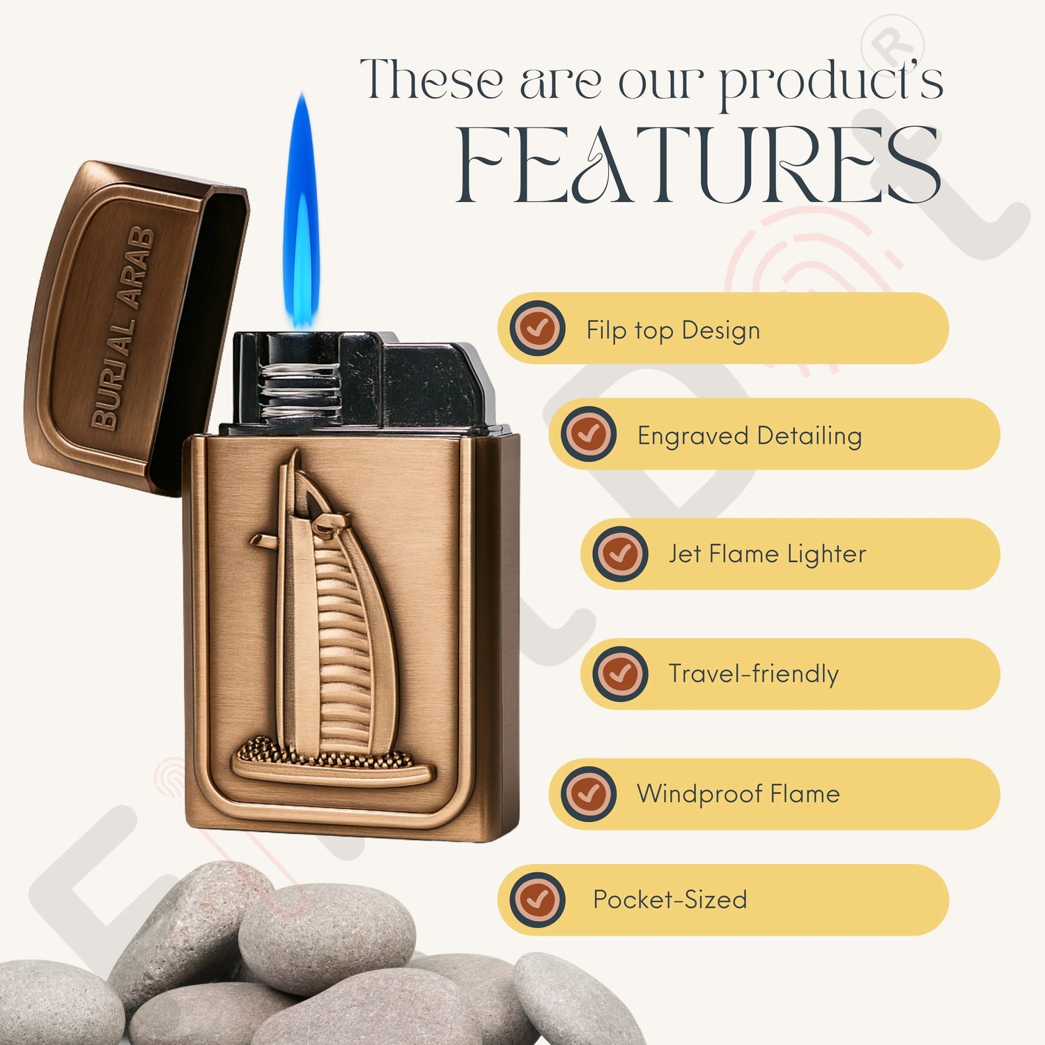 Introducing the First Dot Burj Al Arab – Vintage Brass Finish | Jet Flame Torch Lighter for Men —Engineered for those who value style and precision, this refillable butane lighter features a raised 3D engraving of the iconic Burj Al Arab. Finished in antique brass, it combines elegant aesthetics with everyday utility. The powerful jet flame performs reliably—even in windy conditions—making it perfect for travel, gifting, or daily carry. Compact, durable, and easy to refill with standard butane gas, this piece is both a premium accessory and a collector’s treasure.