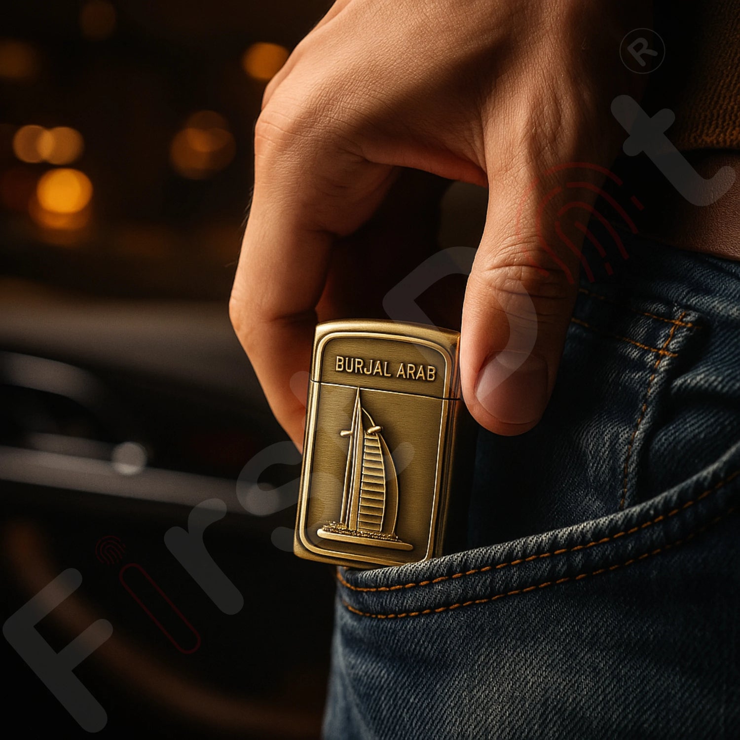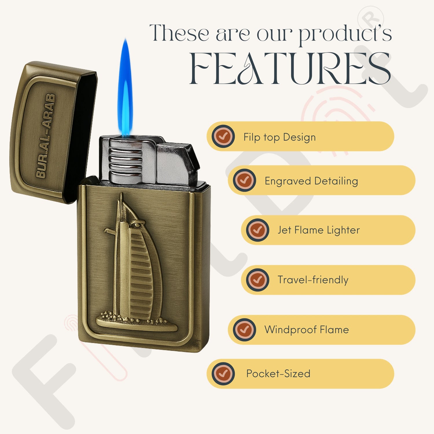 Introducing the First Dot Burj Al Arab – Vintage Brass Finish | Jet Flame Torch Lighter for Men —Engineered for those who value style and precision, this refillable butane lighter features a raised 3D engraving of the iconic Burj Al Arab. Finished in antique brass, it combines elegant aesthetics with everyday utility. The powerful jet flame performs reliably—even in windy conditions—making it perfect for travel, gifting, or daily carry. Compact, durable, and easy to refill with standard butane gas, this piece is both a premium accessory and a collector’s treasure.
