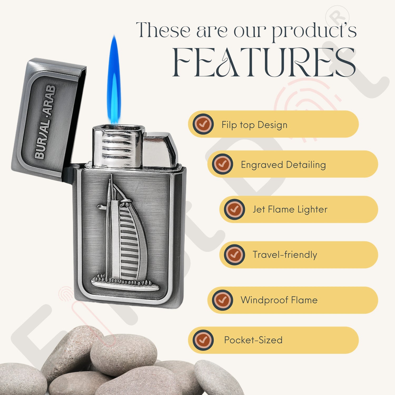 Introducing the First Dot Burj Al Arab – Vintage Brass Finish | Jet Flame Torch Lighter for Men —Engineered for those who value style and precision, this refillable butane lighter features a raised 3D engraving of the iconic Burj Al Arab. Finished in antique brass, it combines elegant aesthetics with everyday utility. The powerful jet flame performs reliably—even in windy conditions—making it perfect for travel, gifting, or daily carry. Compact, durable, and easy to refill with standard butane gas, this piece is both a premium accessory and a collector’s treasure.
