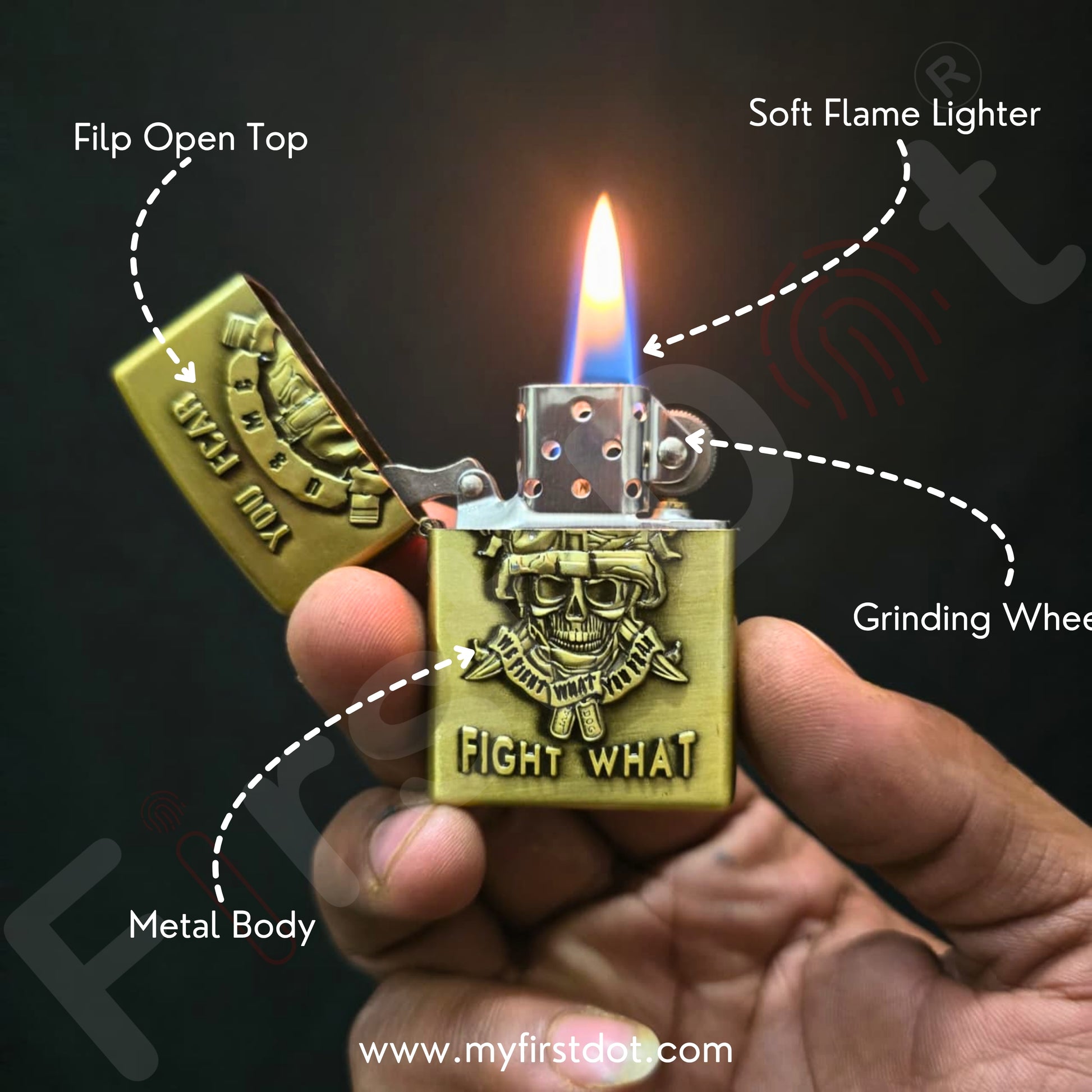 First Dot Embossed Metal Lighters Combo. This premium set includes two solid-metal lighters, each featuring deeply embossed designs that symbolize power, resilience, and precision. Built for performance and presence, this combo also comes with a Free 50ml Premium Lighter Fuel — so you’re ready to light up instantly.