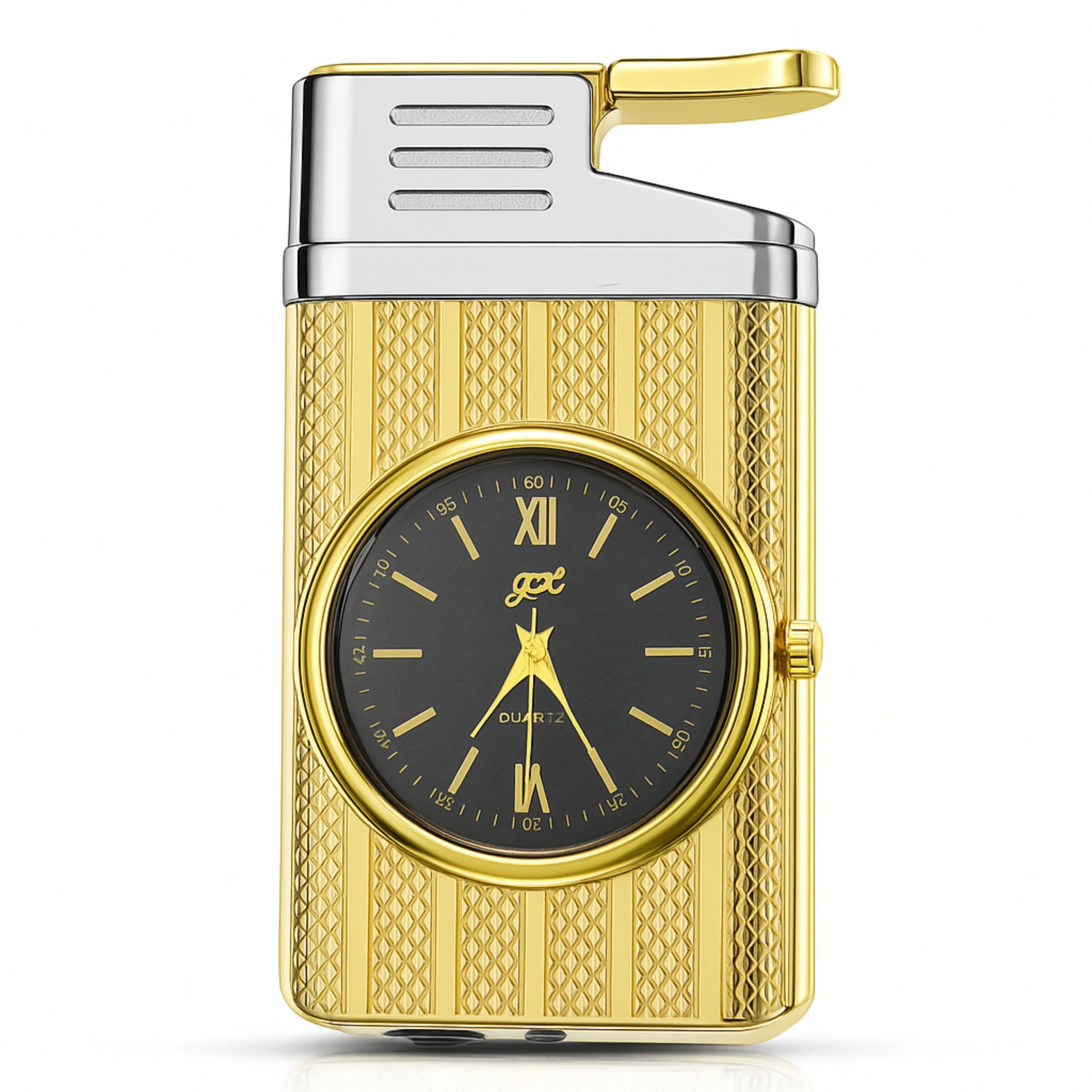 striped watch lighter, jet flame lighter with clock, refillable butane lighter India, men’s quartz torch lighter, premium cigar lighter with time, luxury dual-use lighter watch, gold and gunmetal lighter, pocket watch lighter for men, stylish metal lighter India, gift lighter for executives, quartz flame lighter