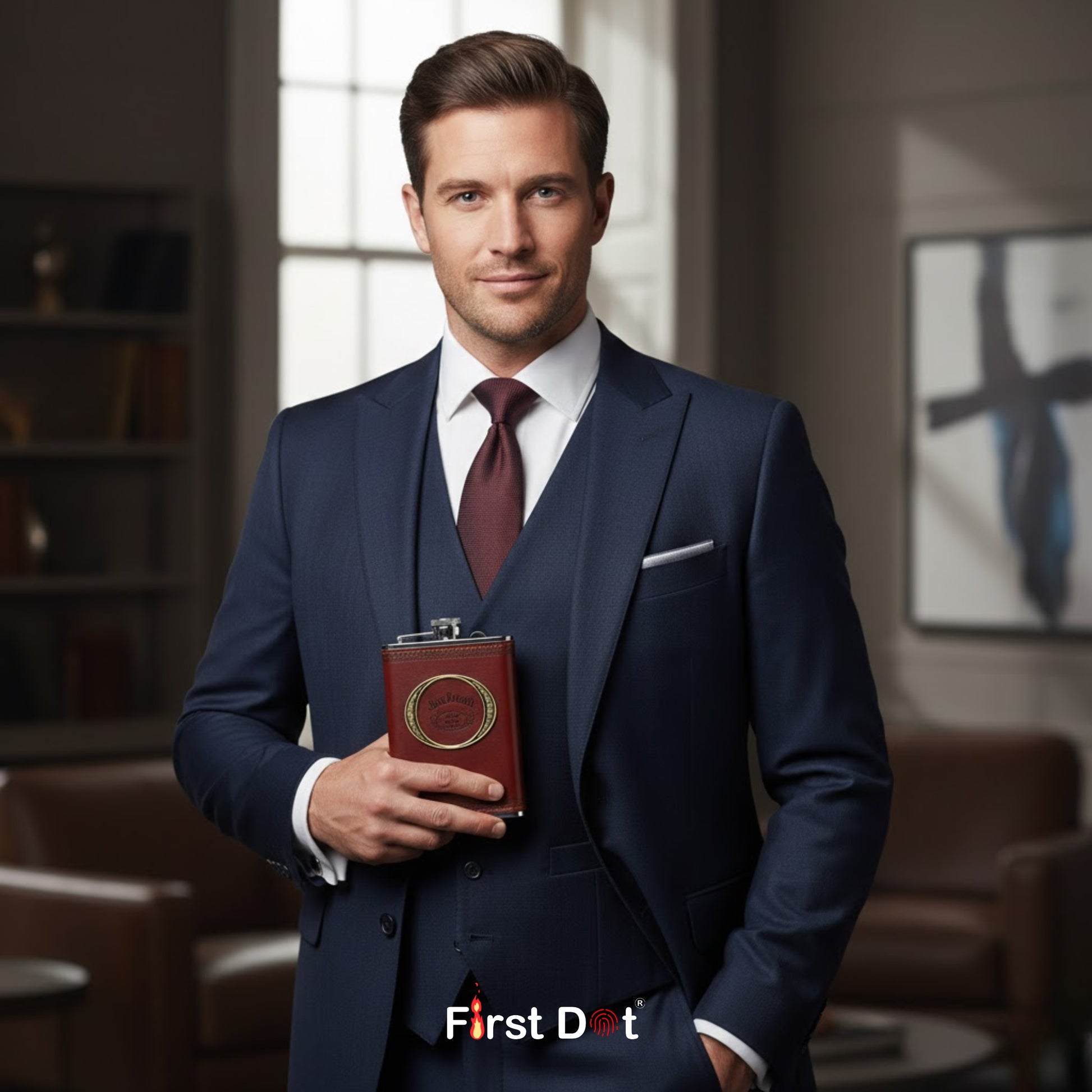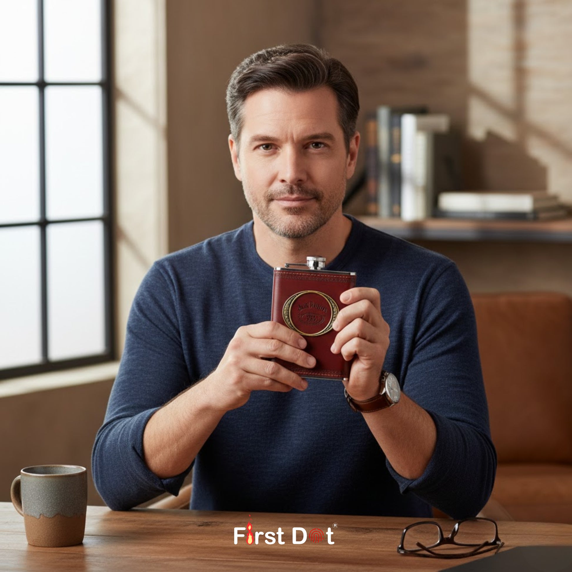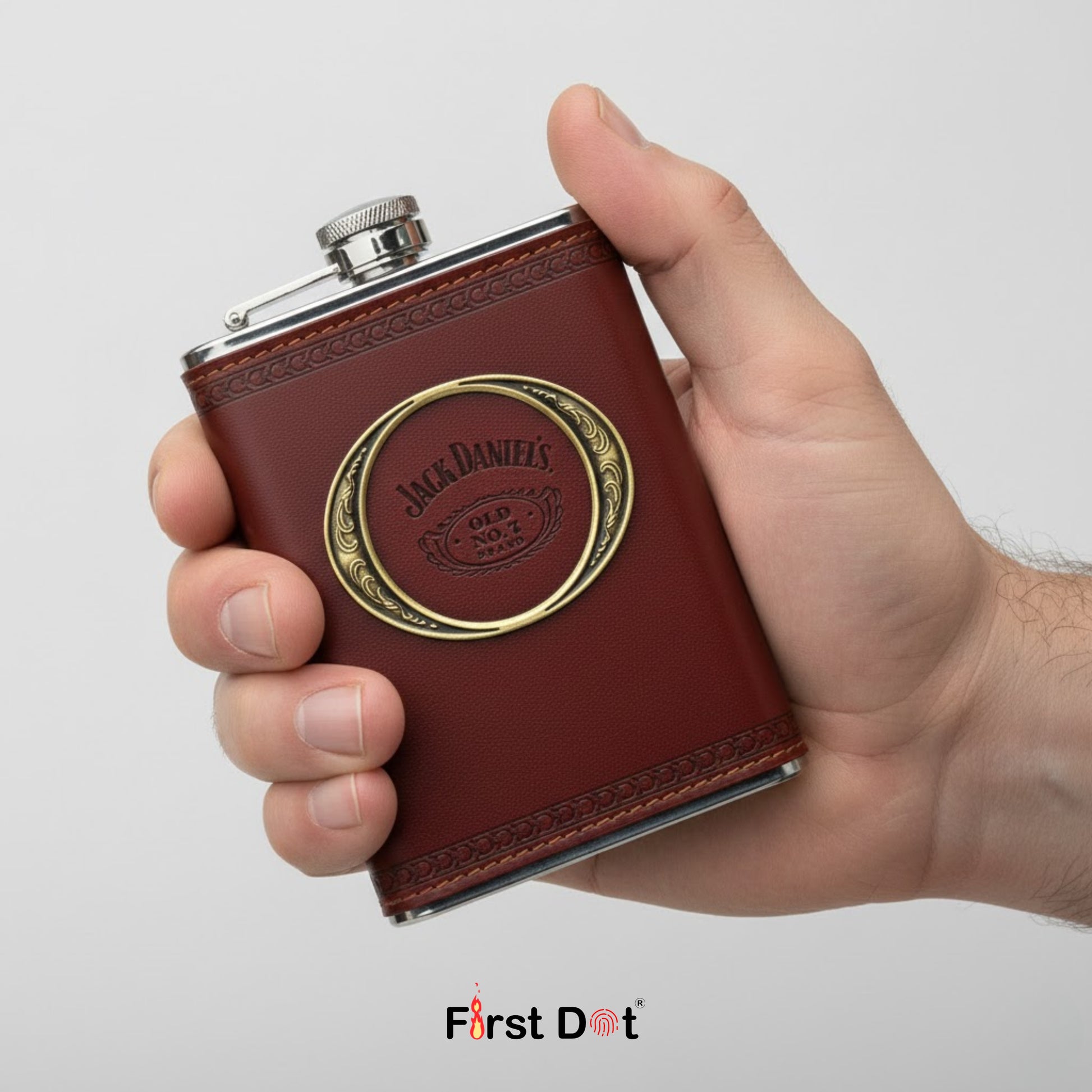 Wrapped in rich leather and finished with a subtle metal front detail, this stainless steel hip flask delivers a balanced look that feels timeless without being overstated. The solid steel body ensures durability, while the leather exterior improves grip, comfort, and long-term usability.